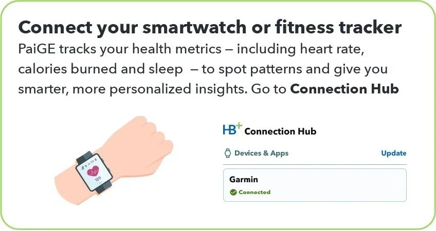 Let’s connect your wearable devices — like your Fitbit, Apple Watch, or Garmin — to HealthBook+. Once connected, the app will automatically pull in key health data such as heart rate, sleep patterns, activity levels, and certain blood measurements. This information is analyzed by PaiGE giving both you and me a clear view of your trends over time and helping spot potential issues early.