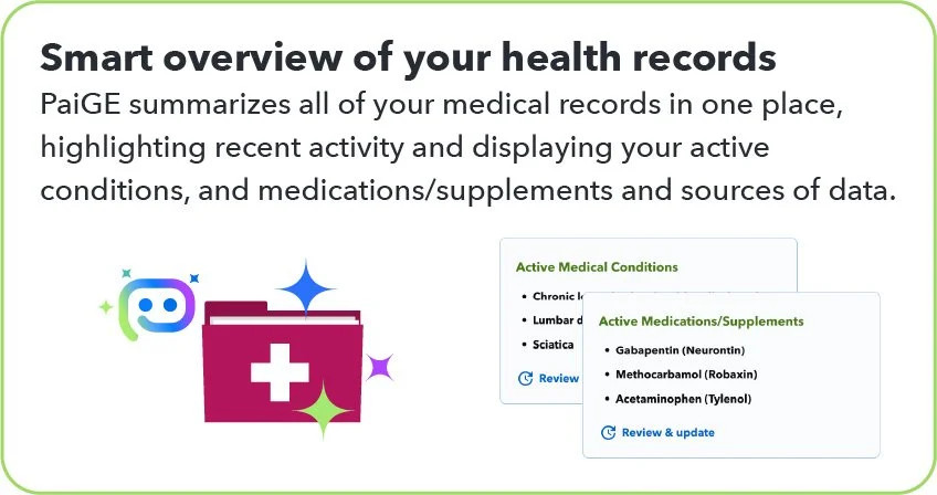 Once completed, you’ll see PaiGE’s review of your records along with a brief summary and active medical conditions, medications/supplements and data sources.