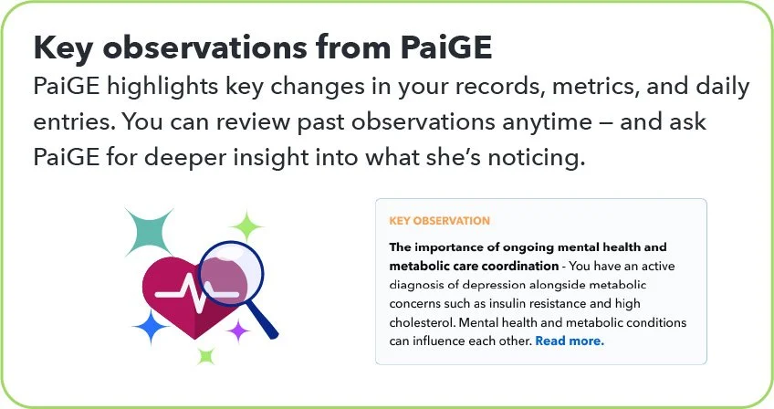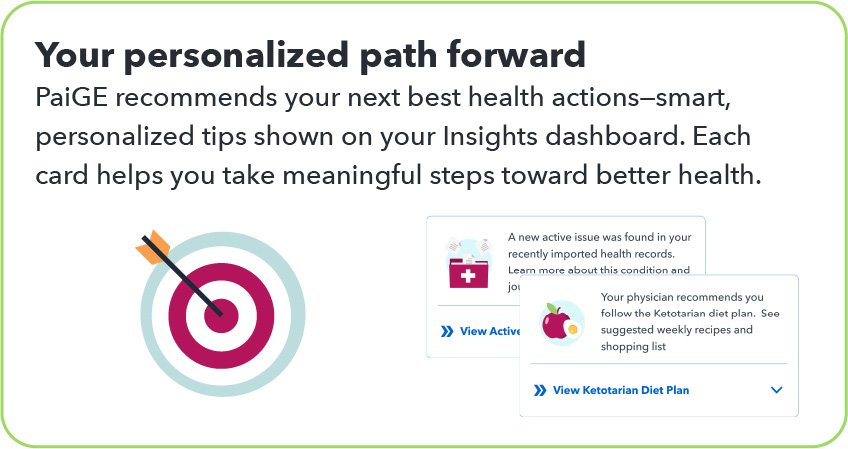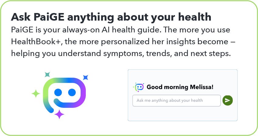 Now I want to introduce you to PaiGE — your personal health assistant within HealthBook+. PaiGE reviews your health records, wearable device data, and the notes you add to your Health Journey. She uses this information to give you smart, personalized guidance about your health. PaiGE also helps me by highlighting important trends and potential issues I might not otherwise see, so together we can make more informed decisions about your care.