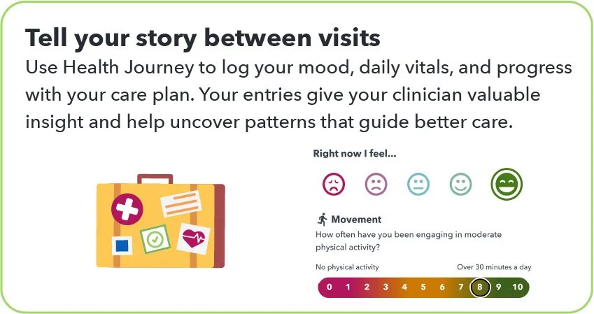This next step is all about staying connected to your own health day to day. By noting your thoughts, using emoticons to capture how you’re feeling, and tracking key lifestyle vitals — like sleep, activity, nutrition, stress, mood, and energy —we’ll start to notice patterns that can guide healthier choices and give me a clearer picture to personalize and improve your care.